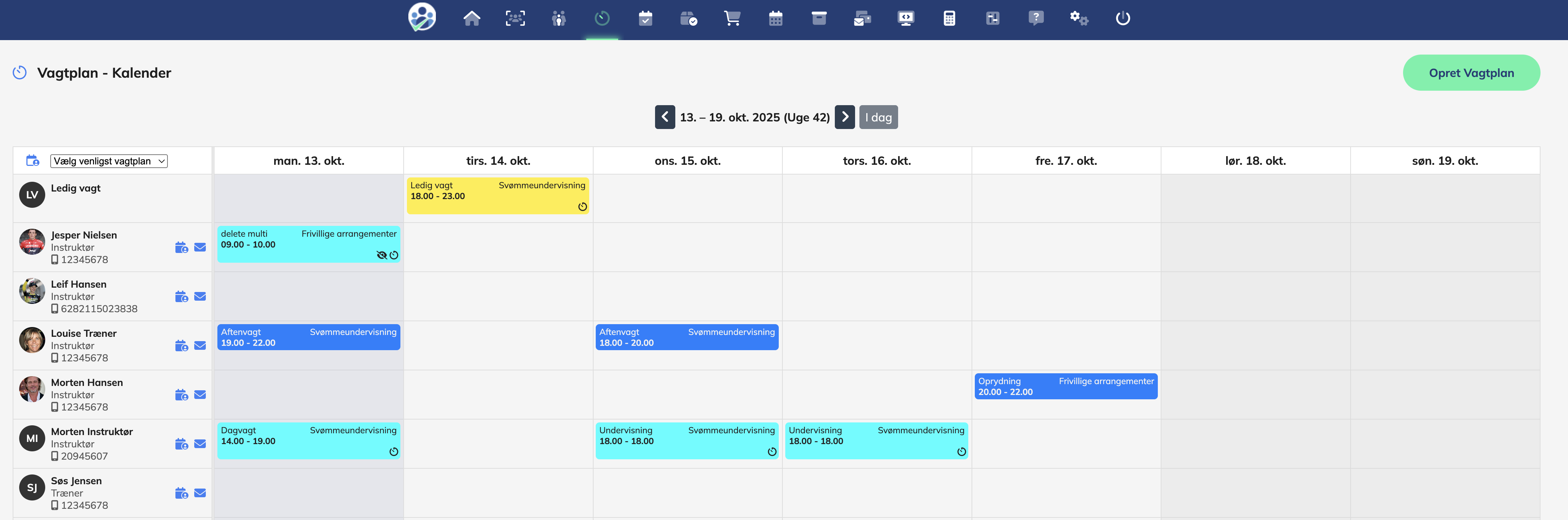 - Oprette faste vagttyper (fx instruktør, hal, kiosk, event m.m.)