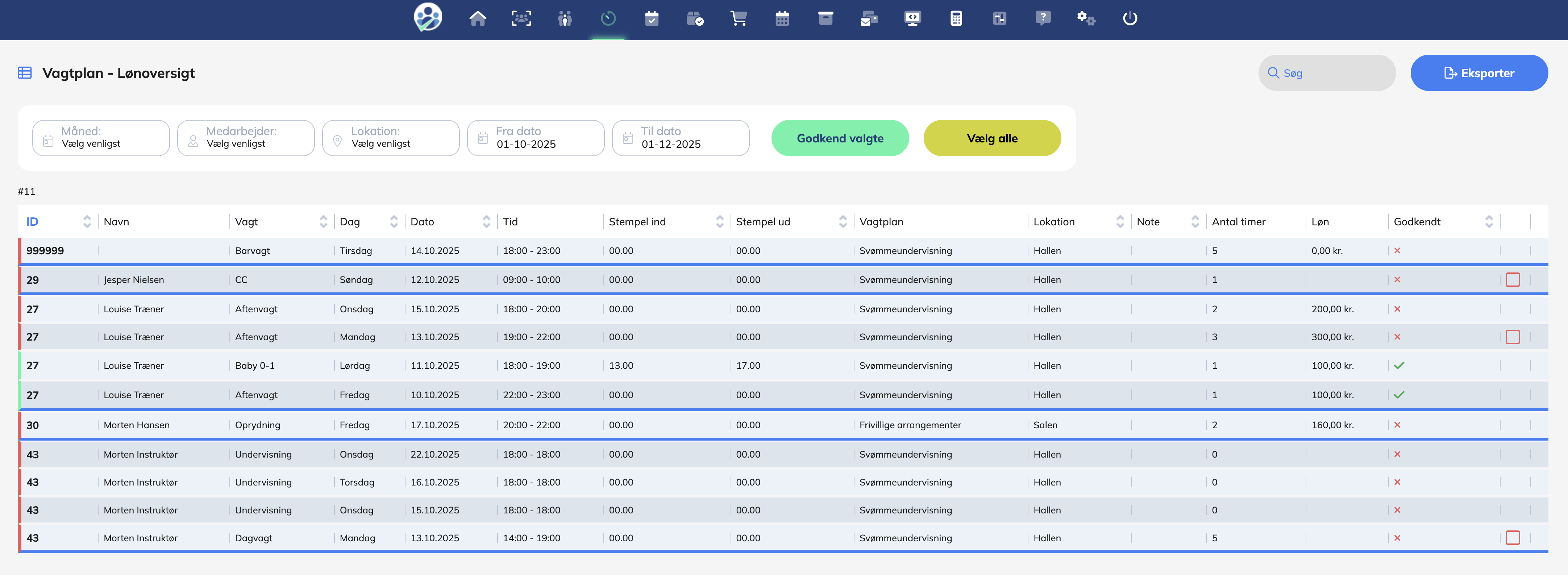 Når vagterne er afsluttet, samler systemet automatisk timerne klar til godkendelse. Herfra kan du: - Gennemgå arbejdstimer pr. person eller måned